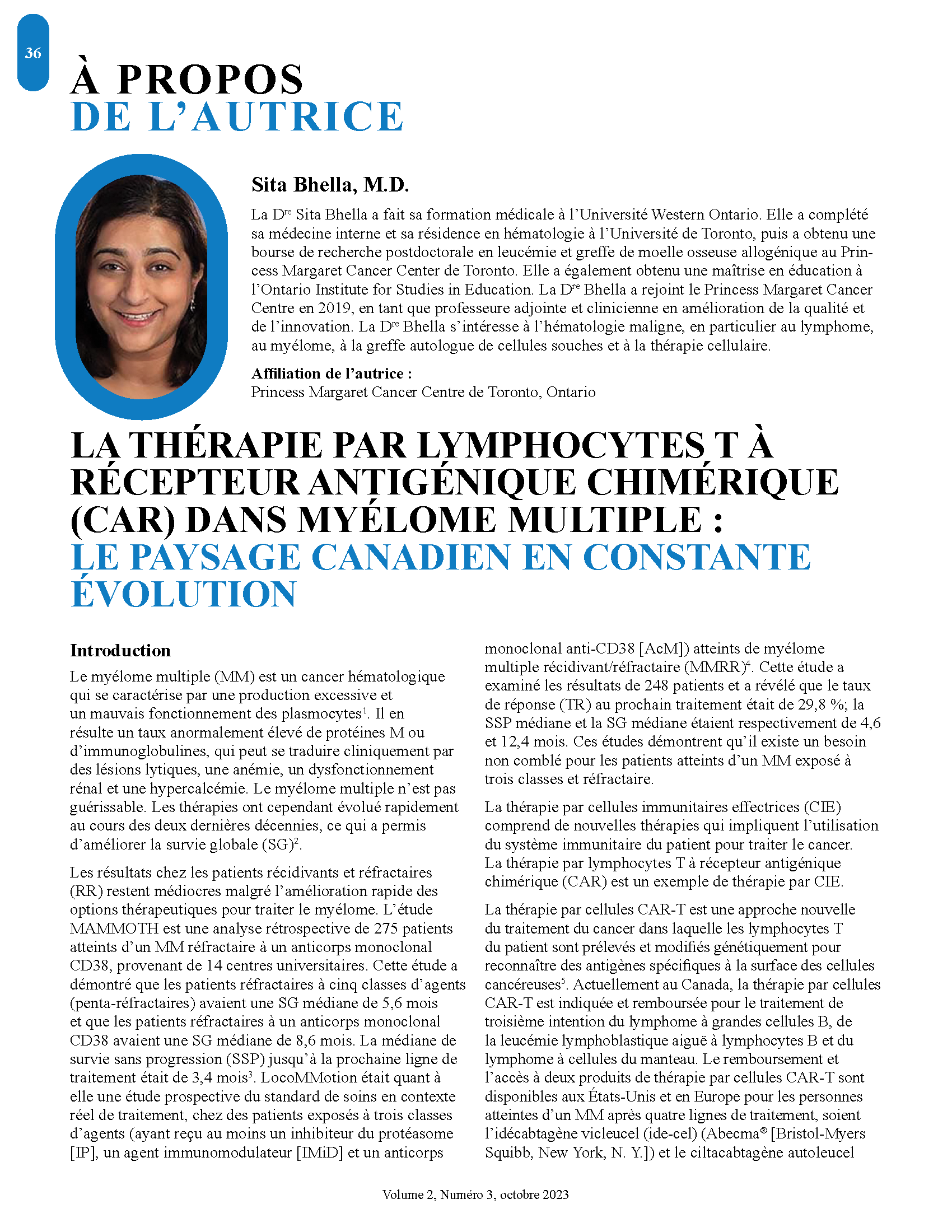 - La thérapie par lymphocytes T à récepteur antigénique chimérique (CAR) dans myélome multiple : Le paysage canadien en constante évolution