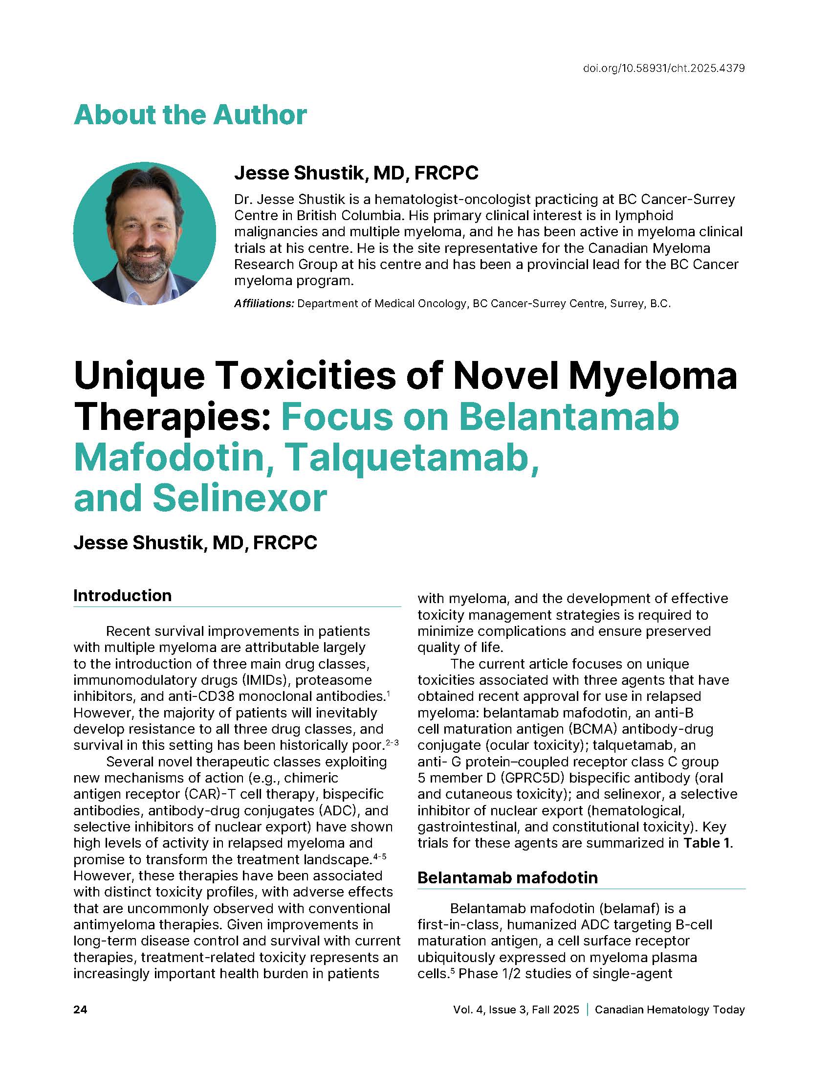 - Unique Toxicities of Novel Myeloma Therapies: Focus on Belantamab Mafodotin, Talquetamab, and Selinexor