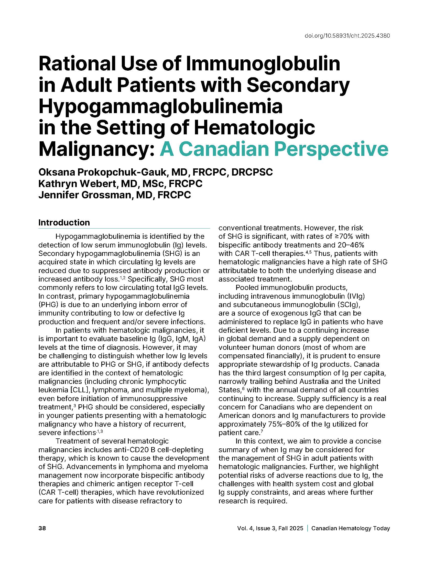 - Rational Use of Immunoglobulin in Adult Patients with Secondary Hypogammaglobulinemia in the Setting of Hematologic Malignancy: A Canadian Perspective